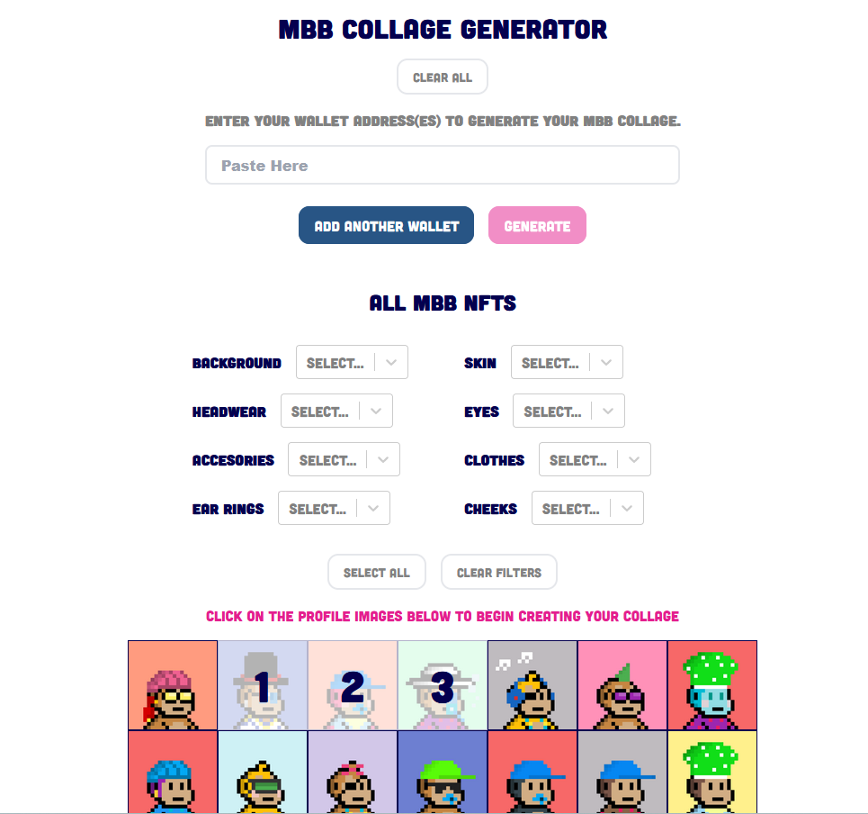 MBB Collage Generator is an interactive MBB NFT collage maker for the Monkey Baby Business community. Members can add their own MBB NFTs and create a collage by pasting in their wallet addresses.
