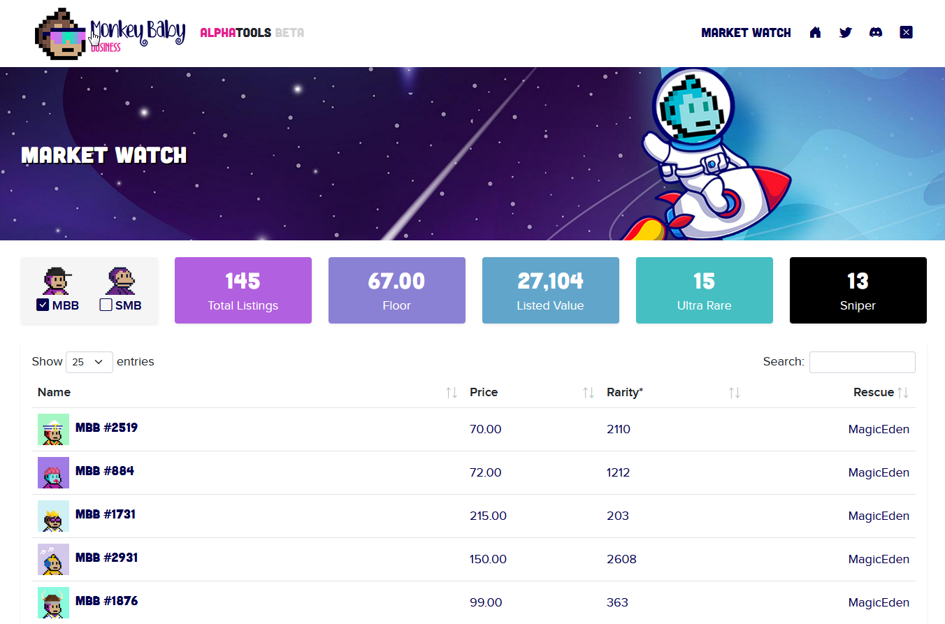 Our initial product, MBB Market Watch & Sniper, was a free tool for members to find value buys across our MBB collection. Users are able to view all available MBB NFTs, and quickly filter by ‘Ultra Rare’ and ‘Sniper’ categories to quickly find the best deals on MBBs.